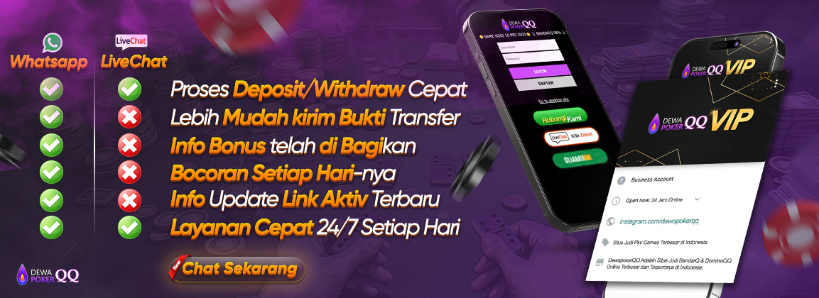DewaPokerQQ merupakan Situs Judi Poker Online Terpercaya yang sudah cukup lama berada di dunia judi online. DewapokerQQ sebagai penyedia permainan permainan judi dominobet yang berbasis online dengan menggunakan uang asli selalu ingin terus memberikan yang terbaik untuk para member setia, seperti misalnya : permainan, pelayanan, minimal deposit, dan keamanan serta juga kenyamanan. DewaPokerQQ sebagai Agen Situs Poker Online Terbaik yang ada saat ini telah menyediakan 8 permainan yang dapat anda nikmati yaitu : Poker, Domino99, BandarQ, AduQ, Capsa Susun, Sakong, Bandar Poker, dan yang terakhir adalah Bandar66. Dengan memberikan berbagai macam permainan remi dan Poker Online yang ada didalam situs dewapokerqq sudah pasti akan mejadi pilihan anda dalam bermain berbagai jenis judi online yang ada pada saat ini.